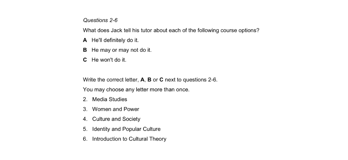 این نوع سوال یکی از سختترین انواع سوالات در آیلتس است. به داوطلب دو فهرست داده خواهد شد که یکی با حروف (A, B, C …) و دیگری با اعداد (1, 2, 3, …) مشخص شدهاند. با توجه به فایل صوتی، باید میان گزینههای این دو فهرست ارتباطات معنادار را پیدا کرد. رمز موفقیت در این تست، فهم کامل و دقیق سوال است. پیش از شروع پخش صدا، به دقت به گزینهها نگاه کنید تا کاملا متوجه شوید درباره چه چیزی صحبت خواهد شد و شما باید انتظار چه پاسخهایی را داشته باشید.