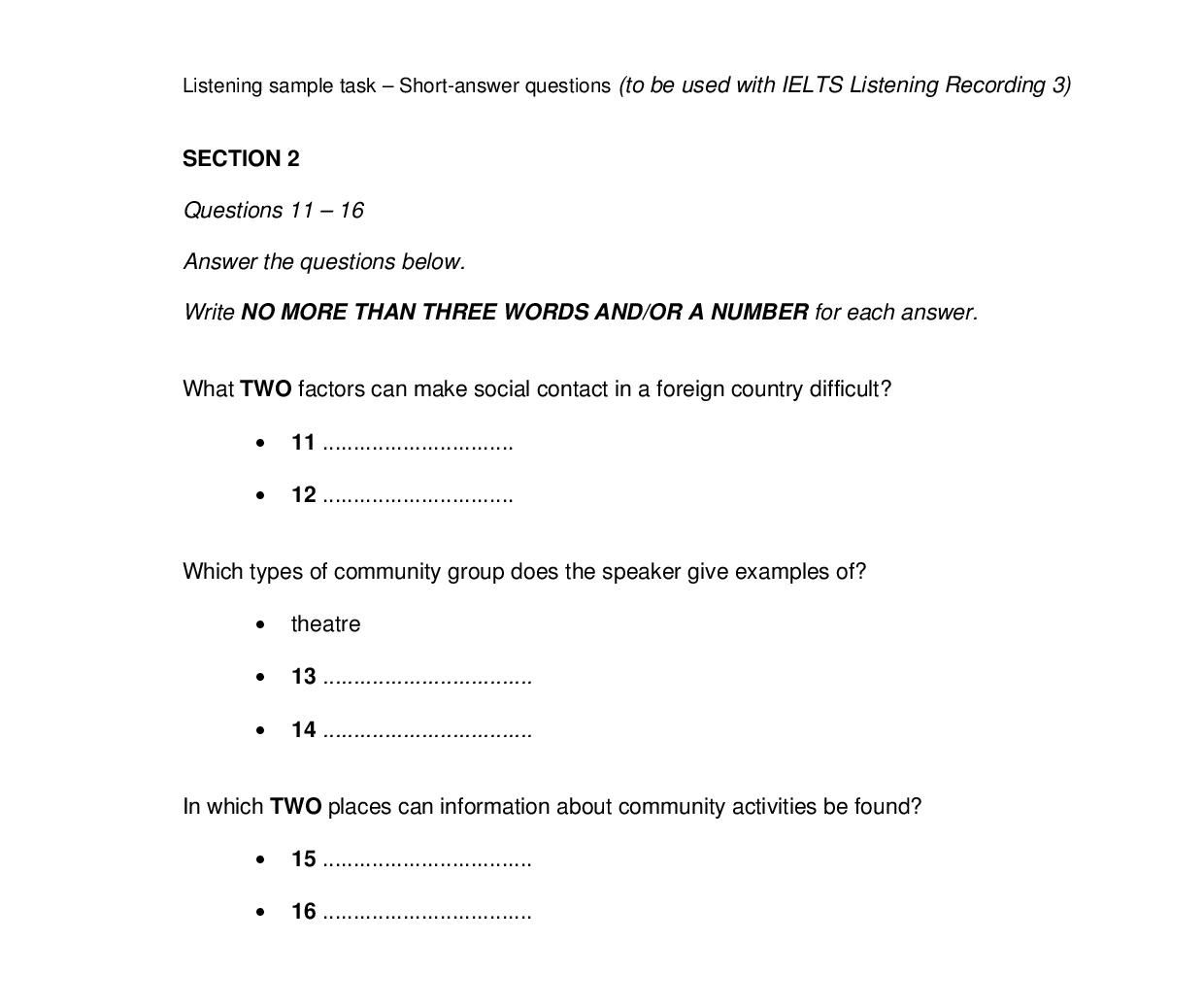 در این نوع سوالات، برای شما فایلی صوتی پخش میشود و جملاتی در برابر شما قرار میگیرد. شما باید انتهای جمله را تکمیل کنید. به جملات، پیش از شروع فایل، دقت کنید. با کمی دقت میتوانید متوجه شوید که چه نوع کلماتی را باید بنویسید. به عنوان مثال اگر آخرین حرف از جمله The باشد، پس خواهید دانست که باید یک اسم را در پاسخنامه خود یادداشت کنید. تاکید میکنیم که به دستورالعمل سوال دقت کنید تا چیزی را اشتباه وارد نکنید. به عنوان مثال اگر از شما خواسته شده که با سه کلمه سوالات را پاسخ دهید، نوشتن عدد نمره شما را از بین خواهد برد.