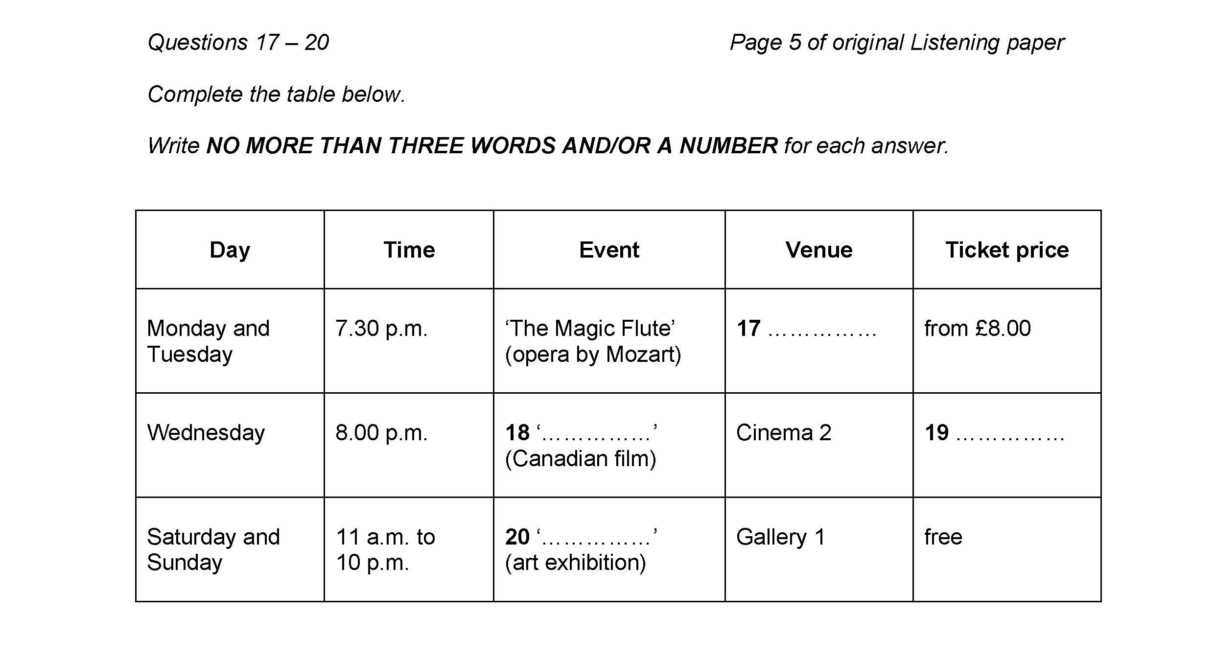 در این نوع سوال نیز شما باید آنچه میشنوید را درون یک جدول بنویسید. بار دیگر تاکید میکنیم که مراقب اشتباهات نوشتاری باشید. پیش از پخششدن مکالمه، فرصت کوتاهی دارید تا جدول را بررسی کنید. به کلیدواژهها دقت کنید و سعی کنید تا جای ممکن روابط میان سطر و ستونها را به خوبی متوجه شوید. در دستورالعمل سوال در مورد تعداد کلماتی که در هر گزینه باید بنویسید، توضیح داده میشود. به آن کاملا دقت کنید. کوچکترین اشتباهی در این مورد باعث حذف نمره شما خواهد شد.